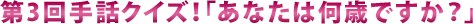第三回は数字の表現です。 「貴方は何歳ですか?」の質問からアナウンス部は大騒動! 手話クイズ、早速ご覧ください。 |