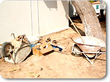 なんていっても、まだ修理のおじさんがうろうろしていましたからね。私の部屋の裏を除いてびっくり。工事用の用具やサンダルや、なぜか半ズボンまで置きっぱなしになっていました。いったいどうなっているのかな。