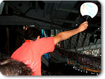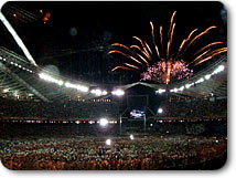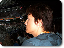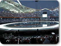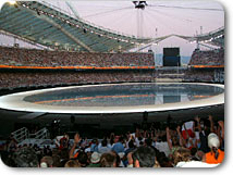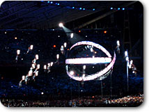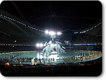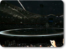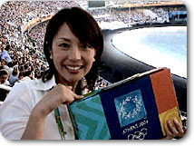 私の横では、松岡、栗山、福田のテレビ朝日オリンピック放送の三キャスターと今回テレビ朝日の特別番組のためにアテネ入りしている福山雅治さんが開会式を食い入るように見つめていました。