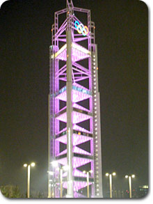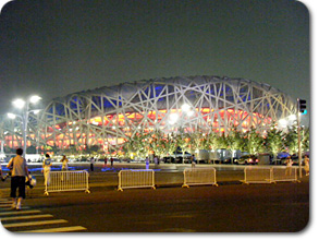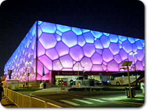 鳥の巣の会場が赤く、その手前にある水立方の会場が青く光っていて、