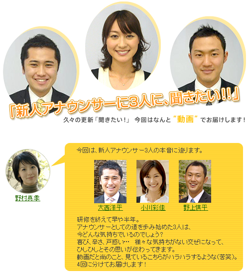 「聞きたい!」は、タイトル通り、「聞いてみたい!」をキーワードに、アナウンサー達の意外な趣味や、オフの過ごし方、はたまた、若手アナウンサーから、ベテランアナウンサーに、アナウンサーとしての記憶に残るあの瞬間を聞いてみるなど、様々な「聞きたい!」をご紹介していく予定です!
