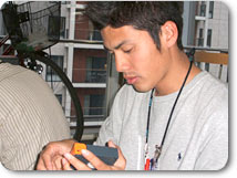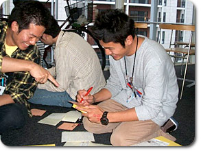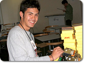 そしてもう一人、加藤泰平はどうしているのでしょう? 探してみると、テープの山の中で、彼の姿を発見!! やはりこちらも現場で研修中でした。 |