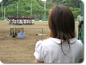 例えばどういうことをしているかというと… @ 高校のグラウンドに行って練習を取材する。 |
