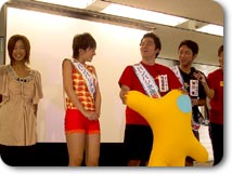 出陣式には、社員はもちろん、松岡修造さんとともにパンパシ水泳のキャスターをつとめる「優香」さんと、