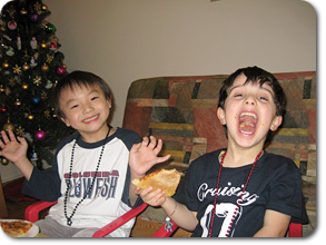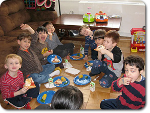 カップケーキやジュースとともに定番のピザも用意され、それらを食べながら子供達が走りまわっていました。 |