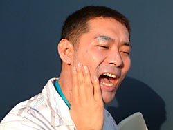 日焼け止めを塗って、さあ、実況の角沢アナ |