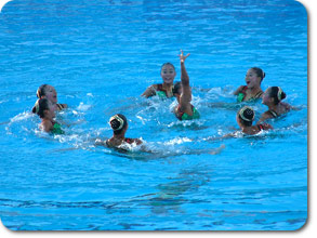 要するに5分間の間に、チーム、デュエット、チームの演技を交代交代にやっていくものなのです。エンターテイメント要素がたっぷり盛り込まれ、見ている人にはとても楽しいものです。