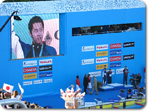 日本の北島康介選手が男子100メートル平泳ぎ決勝に出場。宿敵アメリカのブレンダン・ハンセンに敗れ、銀メダルに終わりました。大会2連覇となる金メダル獲得と世界記録の更新に大いに期待を寄せながら見守ったテレビ朝日モントリオール中継班からは、大きなため息がもれた後、しばらく言葉が続きませんでした。みなさんも同じですよね・・・今思い出しても、本当に悔しいです。