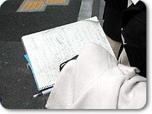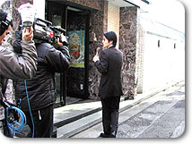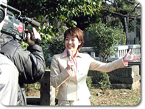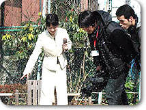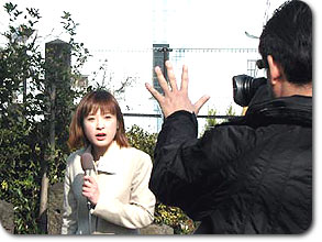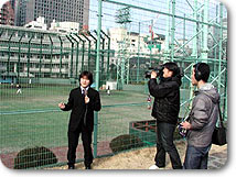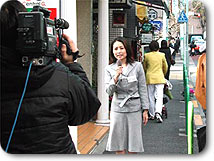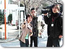 実質、授業はこの日が最終日。明日の合評会へ向けて1分30秒のVTRリポートを作ります。テーマは自由。午前中は青山の街の中をロケハン(下調べ)して構成を考えます。午後からプロのテレビカメラクルーが到着してリポート開始!やはり表情が生き生きしていますね。