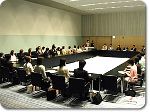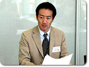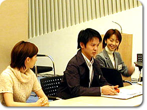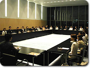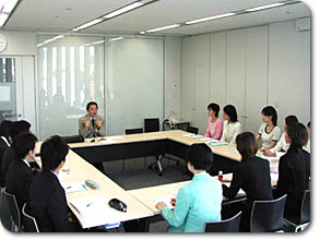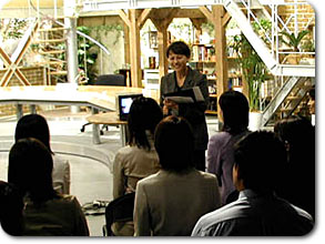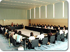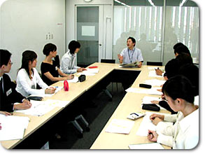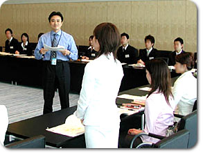 新本社の最上階の特別会議室で開かれた開講式に続いて、早速「発音・発声の基礎」授業が始まりました。この授業、講師は3日間を通して飯村アナウンサーが担当します。時々楽しいギャグ(?)を交えながら、受講生の緊張を解きほぐす役割も果たしました。