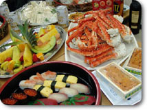 この日北海道に出張してきた堀越部長から‘かに・うに・いくら’の海の幸三大キングがプレゼントされ、テーブルの上はとても豪華!