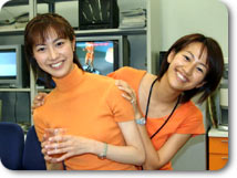 市川アナと前田アナは偶然同じ色のお洋服。うしろのテレビに映っている人も何故かオレンジの衣装です。 |