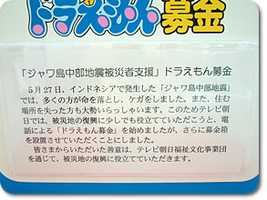 また、テレビ朝日本社ビル1階のアトリウムにも、ドラえもん募金箱を設置しています。 近くにお立ち寄り際はぜひご協力をお願いいたします。 すべての募金は、集計の上、テレビ朝日福祉文化事業団を通じて被災者の支援と被災地の復興に役立てられます。 募金総額及び贈呈先の詳細については、後日テレビ朝日系の番組内やこのサイトなどでもご報告いたします。 |