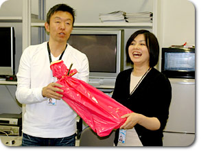 ![]() 全部員に惜しまれながら退任した黒木さん、 これからよろしくお願いいたします、森田さん! ありがとうございました! - ![]() アナウンス部からのプレゼントは、代表して田畑アナが贈りました |