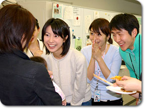 さて、歓送迎会中には意外なゲストも登場! それは産休中の佐分アナでした。 可愛い赤ちゃんを連れての突然の来訪に、みんな大騒ぎ! 相変わらずのサブリワールドが赤ちゃんパワーで倍増していました。 |