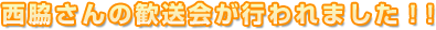 先月末の「やじうまプラス」で、あっと驚かれた方も多いのでは…。 そう。ご自身が発表されていました。西脇さんが、法務部へ異動となります。 なんと、テレビ朝日の中でただ一人、弁護士資格を取得している西脇さん。 今まではその知識が放送で活かされていましたが、 これからは「テレビ朝日」のために活かされていくことになります☆ ということで!!10月12日、アナウンス部では、 「西脇先生を囲む会」 と称して、西脇さんの歓送会が開催されました! |