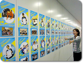 私が入社してからの半年間も、社内いたるところでコツコツ、準備が進んでいました。 たとえばもうおなじみ、こちらのロゴ☆ みんなで作ったこのロゴは、テレビ朝日の50年の歴史を刻む年輪で、 そしてテレビ朝日に関わる全ての人々の“輪”“和”を表すんだそう。 |