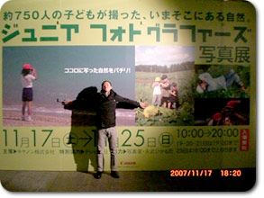 ![]() ジュニアフォトグラファーズ写真展の看板の前で |