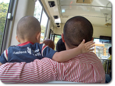 サファリパークを走るバスの車内。偶然座った見知らぬ親子の後ろ。