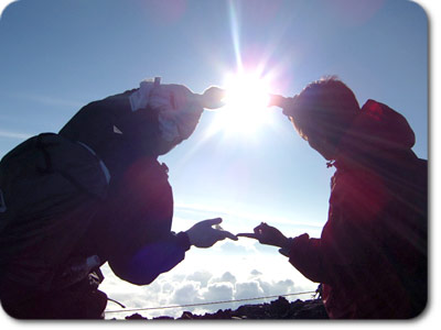 左側が私です。 わざわざ頂上で何をやっているんだ・・・という気もしますが、 つい楽しくなっちゃって(笑) 友人と共に無事に頂上につくことができ、新たな絆が生まれた瞬間です!