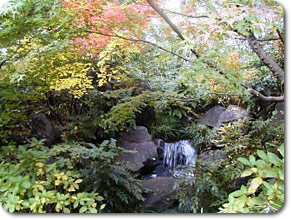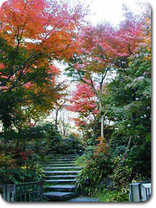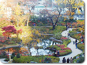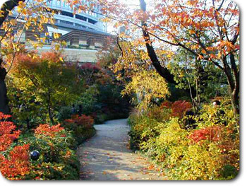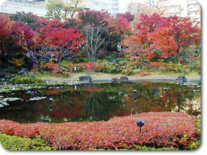 木々の紅葉がそのまま光になったような赤で彩られた毛利庭園。 |