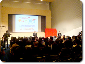 なんと!今回のテレビ塾は受講者80名。 この数は、過去8回開かれたテレビ塾の中でも最大数だったそうです。 実際に皆様を前にすると・・・ あぁぁぁ。緊張してきました。新人3人・・・。 |