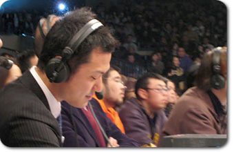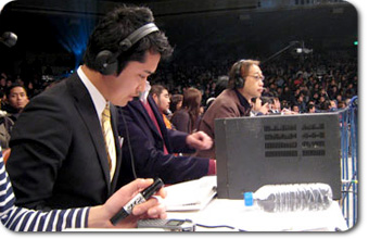 続いて、大西アナが第2試合を実況。 大西アナは去年12月の福岡国際マラソン第3中継車で 実況を経験していたこともあり堂々とデビュー! 2人共予想以上にナイスな出来で、バッチグー、グー☆ エド・はるみさん風に褒めてみました^^ 2人の実況は、 毎週土曜日の「ワールドプロレスリング」と BS朝日で放送「闘魂スーパーバトル」でご覧下さい! ちなみに、この日は大のプロレスファン・下平アナも! |