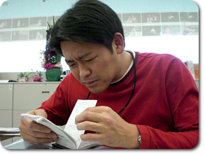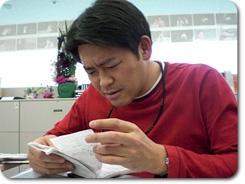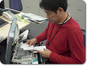 ここで・・・田畑さんから「人に聞く前に、お前らはちゃんと勉強してるのか??」と問われ・・・。 ・・・・・・・・・・・・・・・・・・・・・・・・・・・・・・・・・・・・・・・・・・・・・・・・・・・・・・・・・・・・・・・・・・・・・・・・・・・・・・・・・・・・・・・・・・・・・ 最後は、我々新人の勉強ぶりを簡単に。 まずは小川さんから。 ・・・・・・・・・・・・・・・・・・・・・・・・・・・・・・・・・・・・・・・・・・・・・・・・・・・・・・・・・・・・・・・・・・・・・・・・・・・・・・・・・・・・・・・・・・・・・ 「サンデープロジェクトのスタッフがまとめてくださった政治経済関連の新聞の記事コピーを、 毎日読み、各紙を読み比べるなど、理解を深めています!」 |