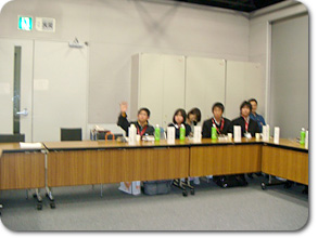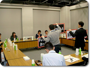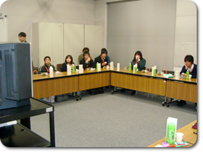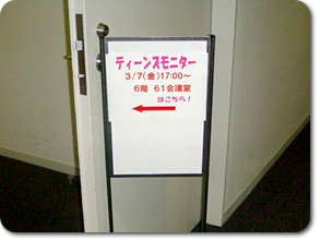 ぬぬぬ??中では一体何が行われているのか。 大学4年時に行った教育実習では「野上先生」と呼ばれた私、 「ティーンズ」と聞くと黙っていられない!! そこでカメラマン大西を引き連れ潜入調査を開始することに・・・ 中には、10数名の学生の姿と、社内の先輩方が。 ここで、これから何が行われるのでしょうか。 「では、ティーンズモニターを始めます」 そう、テレビ朝日では、定期的に公募したモニターの会議を開催し、 視聴者の皆様の意見を番組に反映させているのです。 今回はその定例会議のひとつ。 議題は「クイズ番組」です。 会議の内容を一部紹介すると、実際に番組のVTRを見てもらい、 細かなところまで質問を投げかけます。 出演者はどの人がいいか?テレビで見たい出演者は誰か? クイズのテンポはどのくらいが見やすいか? ナレーションのスピードは、どのスピードが聞きやすいか? 字幕テロップの字体や、文字の背景の色は? |