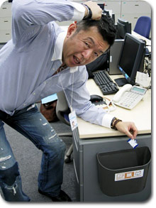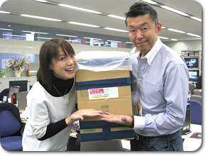 さて、この『ゴミの分別キャンペーン』が始まってもう1ヶ月あまり経ったわけですが アナウンス部ではどんな変化が・・・?? と取材を始めようとしているところに、 なにやらゴミ箱の前で「ダンボールは・・・」とつぶやいている人発見!!! |