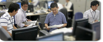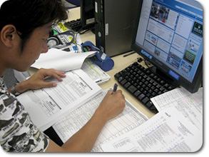 ![]() 実況やレポートを担当される方々が取材資料を整理しているところ。 左から中山、森下、角澤、清水アナウンサー。 |