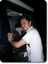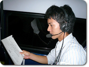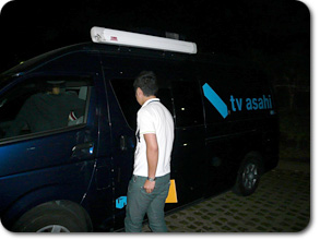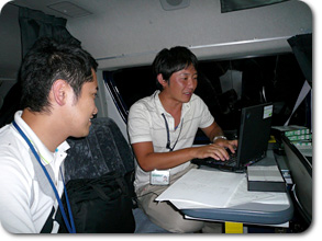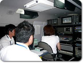 立派な編集機材がちゃんと積まれています。 その日終了したばかりの試合を本番に間にわせるため急ピッチで編集します。 いや〜本当に車の中がミニ編集室になっているんですよ。びっくりしました。 |