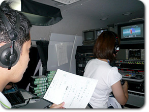 ![]() 橋本ディレクター(奥)と原稿の確認をする大西アナ(手前)。 |