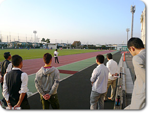 グラウンドにて取材中。 |