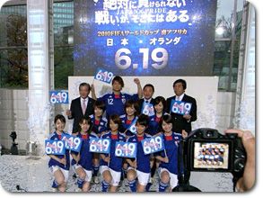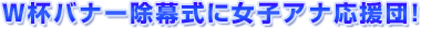 式の中では、私たちアナウンサーからも一人ずつ応援メッセージを寄せました! まずトップバッターの松尾さんは「宮崎県出身」ということで、 続いて、堂さんは、幼少時代をスイスで過ごした経験を持っていることから、 上宮さんは、得意の英語を使ってのエール。その発音の良さに香取団長も驚いていましたよ! 大下さんは、これまでフランス大会、日韓大会、ドイツ大会と3大会全て取材してきました!と言って、会場の笑いを誘っていました。 武内さんは、バンクーバー五輪放送時の民放キー局による共同CMの応援歌を替え歌で披露していました。かっこよすぎます! 小川さんは、同じ番組の小宮悦子さんも大のサッカーファンなので、一緒に盛り上げていきたい!と。 そんな先輩方のウィットに富んだコメントの後、私・竹内もメッセージを送りました!