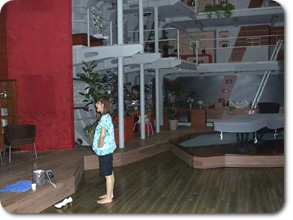 打ち合わせの合間、暗闇のスタジオで熱心に発声練習 |