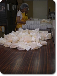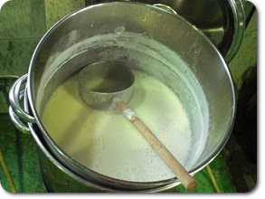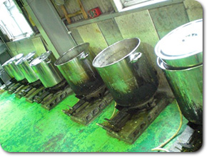 レモンの爽やかな香りの充満している工場内。 床が石鹸のツルツルで転びそうになります。 奥へ進んでいくと、ずらりと並んだ、寸胴鍋。 この中で石鹸を調合しているのです!! |