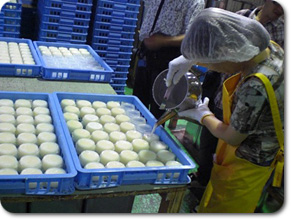 カキにはやはりレモンが合う!ということでこの香りにしたんだそうです! あとはお玉と薬缶で、型に一つ一つ丁寧に流し込んでいきます。 さらにこれを冷却し、乾燥させ、完成です! |