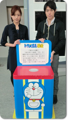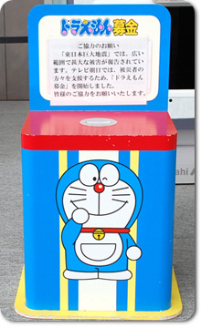 東日本巨大地震発生後、 テレビ朝日では東日本巨大地震による被災者を支援するため、 詳しいアクセスの仕方や、「ドラえもん募金」についての情報は、こちらをご覧ください。 http://www.tv-asahi.co.jp/doraemonbokin/index_top.htmlまた、テレビ朝日1階アトリウムにも、募金箱が設置されています。