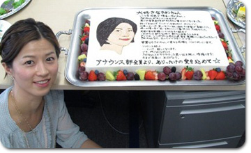 ![]() 石井さんの似顔絵とメッセージが書かれたサプライズケーキなんですっ! |