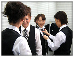 「ネクタイってこうだっけ?」「あ、こう巻いた方がスッキリ見えるよ!」「でも正しくはこうだよね?」「○○ちゃん、巻くのうまーい!」「私、制服にネクタイがついてたんで、3年間結んでたんですよね。」「へぇ、私はセーラー服だったからなぁ。」「ええ!羨ましい!うちの制服、変なブレザーだったんだよねぇ・・・。」・・・(制服談義つづく)・・・。