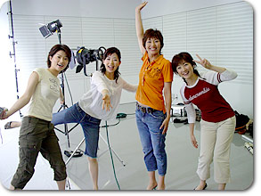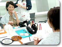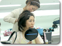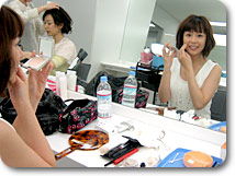 「映りは照明次第」・・・とは女優さんがよくおっしゃることですが、 やはりいい笑顔で、美しく映りたいのが、オンナゴコロですもの。 今回、プロの照明さんにバシッとキラッとライトを当ててもらいましたよー♪ セッティングが着々と進む中、 女子アナウンサー諸氏は、メイクルームでお顔をセッティング(笑) オフをパチリと激写! |