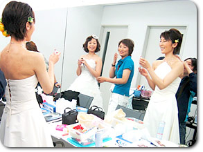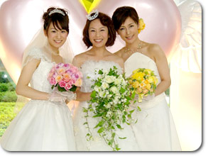 一緒に着た武内さんや堂ちゃんはもちろん予想通り『超』かわいかったですが、 私は…『正直、柄じゃないしなぁ…』と思いつつ、 着てみてビックリ。 『あれ?意外と悪くないんじゃないの?!』 …うーん。ウェディングドレスマジックおそるべし。 |