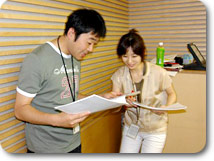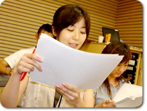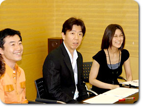 第一声を発した桜井さん。今回はAD役(!) おじいちゃんから子供まで、国民の声を代読するのが、 ニューヨークから帰ったばかりの、真鍋さん。 |