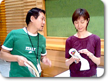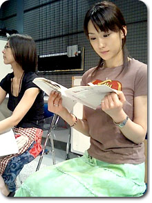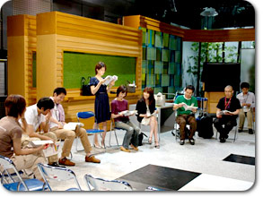 やじうまプラス終了後のスタジオを借りて、思う存分声を出したり動き回ったり。 実際に台の上で(舞台に見立てて)台詞回し。 「ってゆうか〜だりぃしさー」 ・・・アナウンサーとしては、絶対言わない「語尾上がり」「ギャル言葉」は、 この人のセリフです。 |