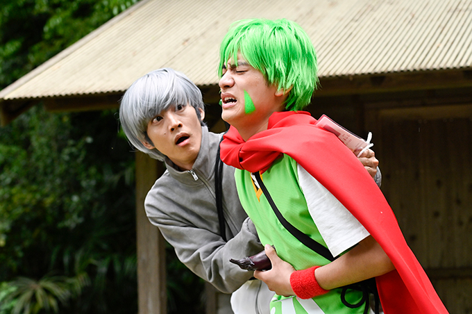 そしてこのスピンオフ作品、実写版『SEIKAの空』の脚本を手掛けるのは、劇団「ヨーロッパ企画」の角田貴志。『あのキス』には、週刊少年マキシマムの編集長・生馬忠士役で出演している角田が、今作では脚本を担当、さらに作中には敵役であるナスの怪人・ナスッテ役としても登場。顔を紫色に染めて挑みます。