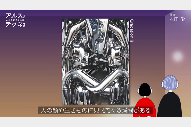 第14回の放送に登場するのは、バイクのエンジンや楽器といった無機質な人工物を、デジタルとアナログを組み合わせた独特の手法で描きだす画家、牧田愛さん。遠近感のずれや歪みをともなった曲線は、艶めかしくうごめく生き物のようにも見え、観る人を驚きと共に、絵の世界に引き込んでいきます。牧田さんにいざなわれる有機と無機の境界とは?