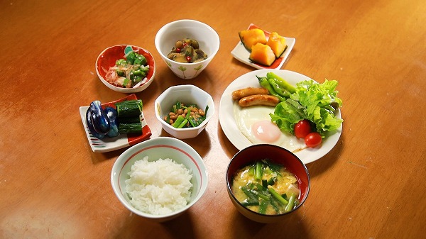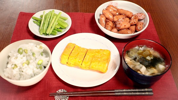仕事のあとの朝メシは、枝豆を使った炊き込みご飯や卵焼き!