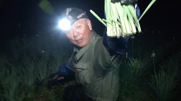 山形県でニラ農家を営む天口さん。一番みずみずしいタイミングで出荷するため、収穫は毎晩 深夜3時から開始!ニラの切り口からはツユがあふれ出すほどのみずみずしさ!奥さんと一緒に朝までに約2000株ものニラを収穫します。