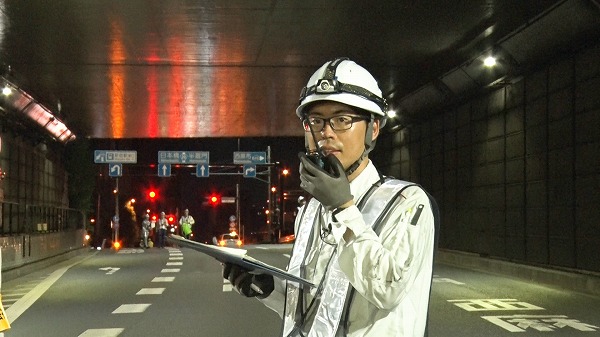 防災設備の点検作業を行う増田さん。今回は年に1度行われる「新宿御苑トンネル」大規模点検作業を指揮します。交通規制がされる夜11時から翌朝6時までという限られた時間の中で、全長840mのトンネルに設置された計68個もの消火器の点検や、災害時に発動される水噴霧設備など防災設備を丁寧にチェックしていきます。